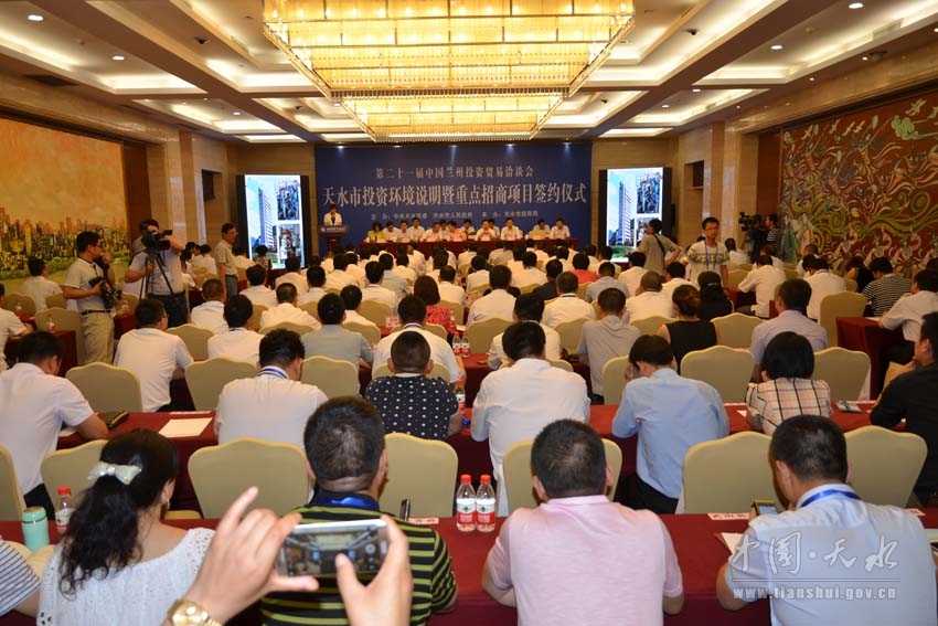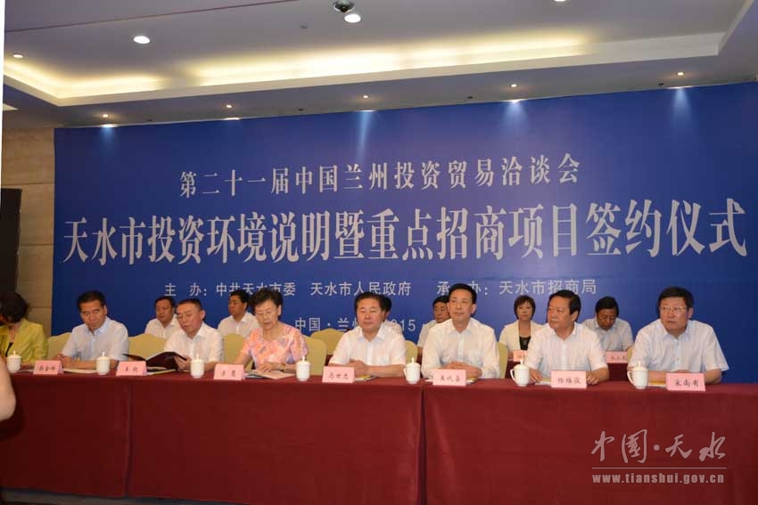 7月6日下午,第二十一届中国兰州投资贸易洽谈会天水市投资环境说明暨重点招商项目签约仪式在甘肃国际会议中心隆重举行。甘肃省人大常委会副主任李慧,副省长、省公安厅党委书记、厅长马世忠,省外事办主任王代喜,省商务厅副厅长马琨,天水市委书记王锐,市人大常委会主任柴金祥,市委副书记、市长杨维俊,市委副书记、市政协主席宋尚有,市委常委、副市长张明泰,市委常委、秘书长蒋晓强,市委常委、副市长宋德雄,市政府副市长温利平,天水经济技术开发区管委会主任马小龙,市政府秘书长逯克宗等出席会议。会议由宋德雄主持,杨维俊致辞,温利平作主题推介。